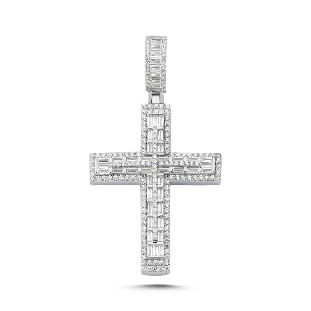 925 Silver Large CZ Brilliant and Baguette Cut Cross
