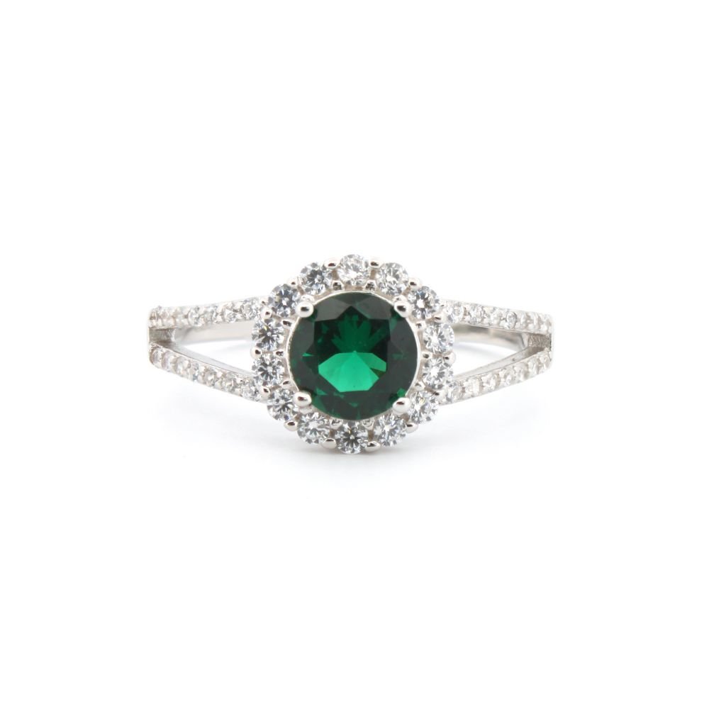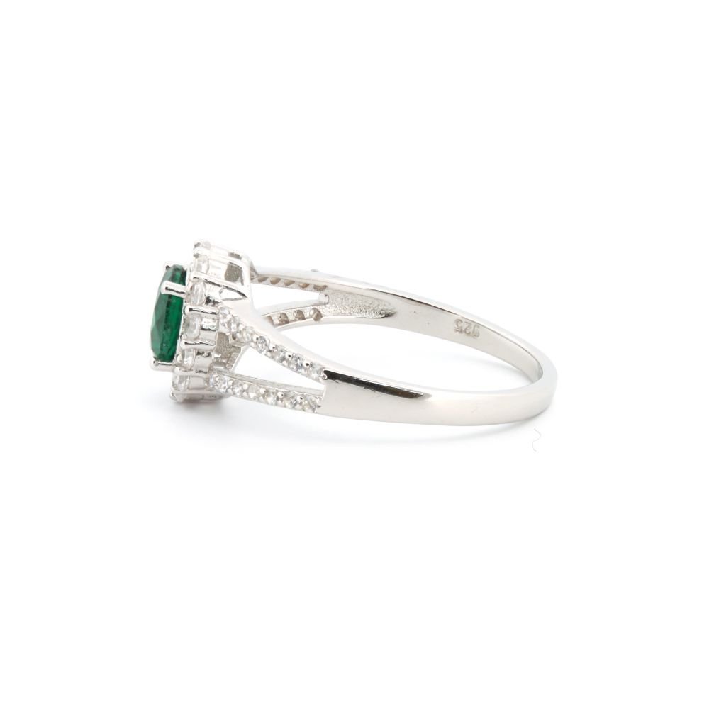925 Silver Rhodium CZ Set Round Cluster Emerald Green Centre