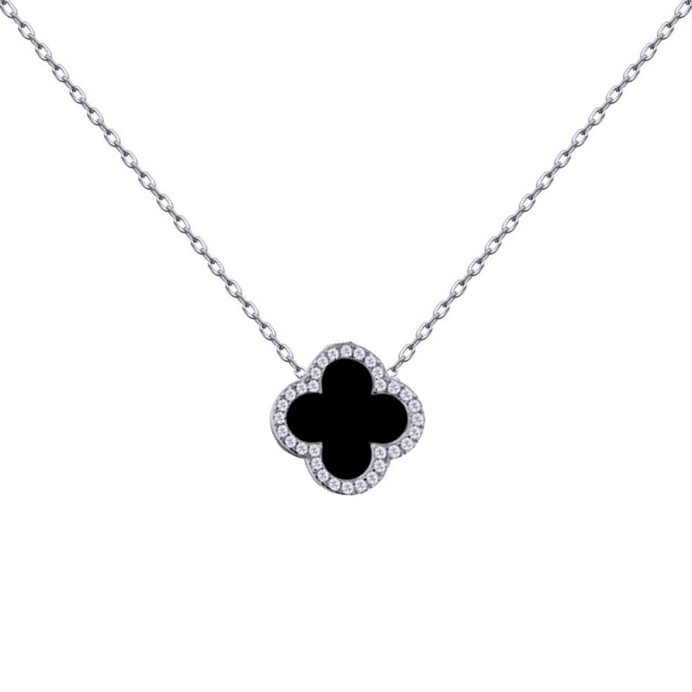 925 Silver Rhodium CZ Set Single Clover Necklace Black Onyx Colour