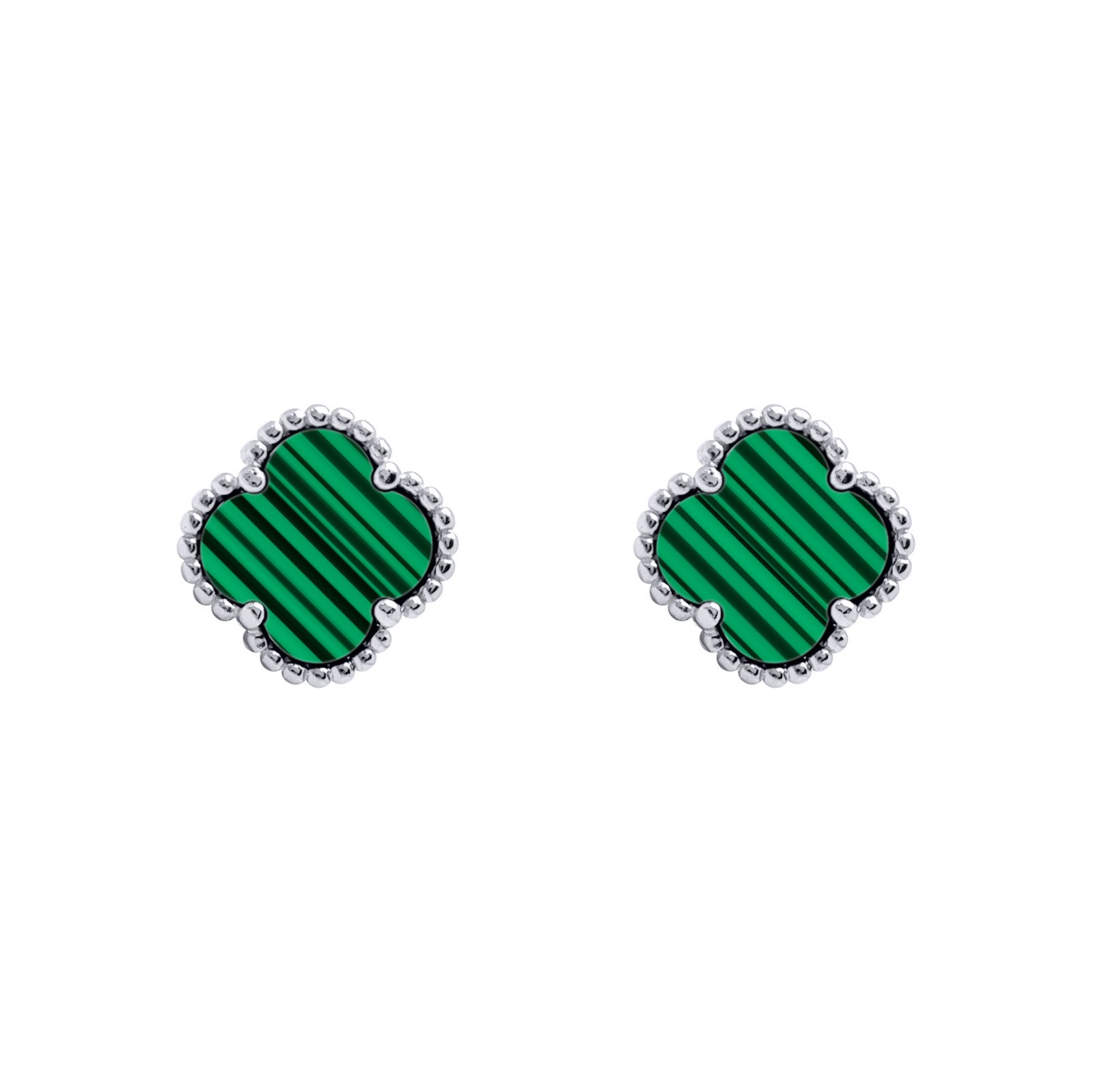 925 Silver Rhodium 5 Clover Stud Earrings Malachite Green Colour