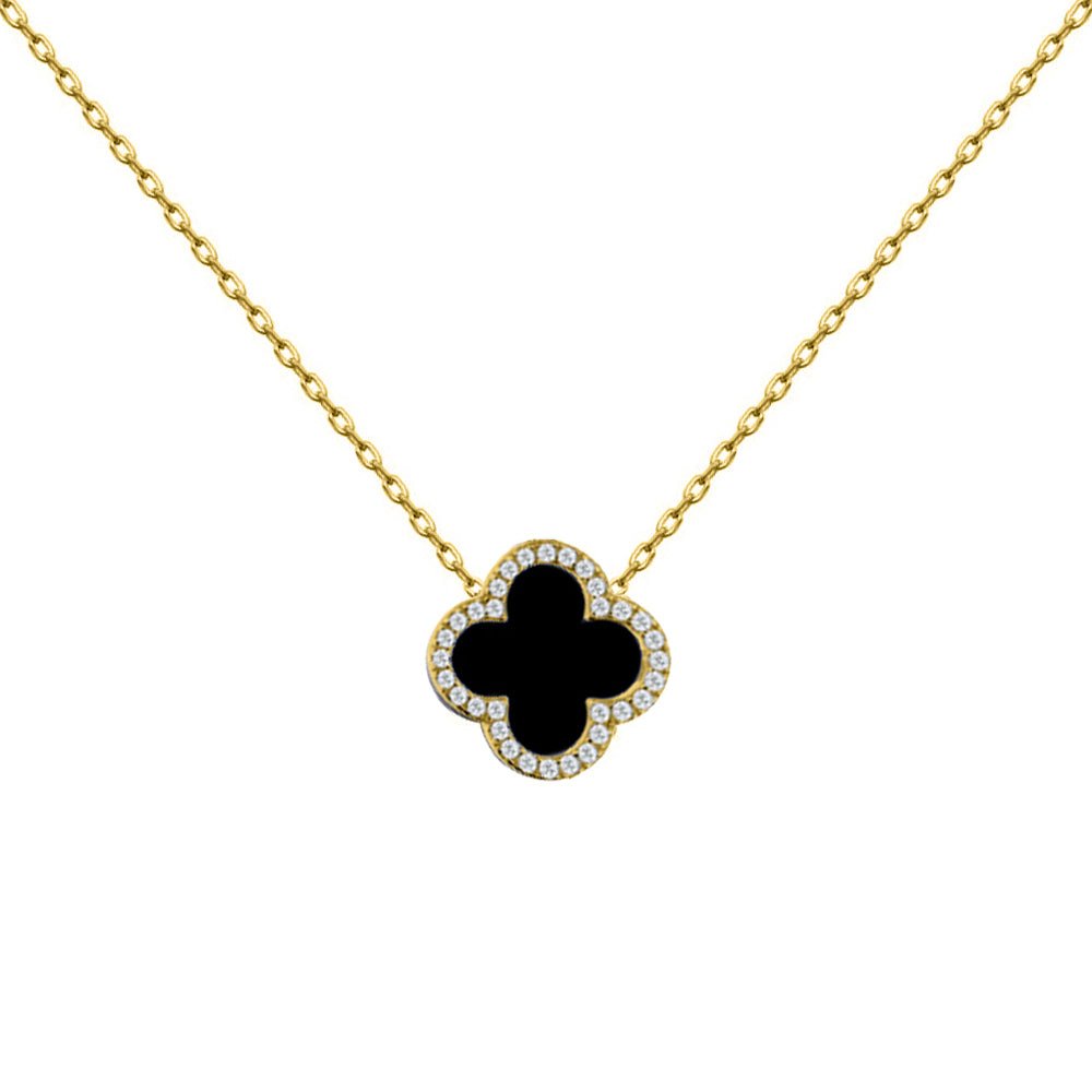 925 Silver 14ct gold Plated CZ Set Single Clover Necklace Black Onyx Colour