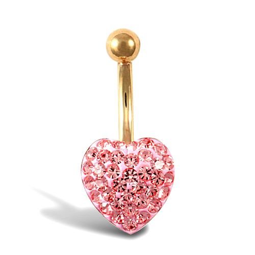 9ct yellow gold belly bar with a crystal-set end pink heart.