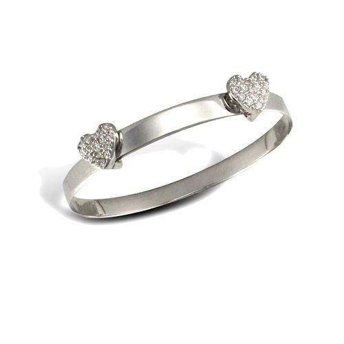 9ct White Gold Flat Childrens / baby Expandable Bangle With Two Cubic Zirconia Set Heart’S.