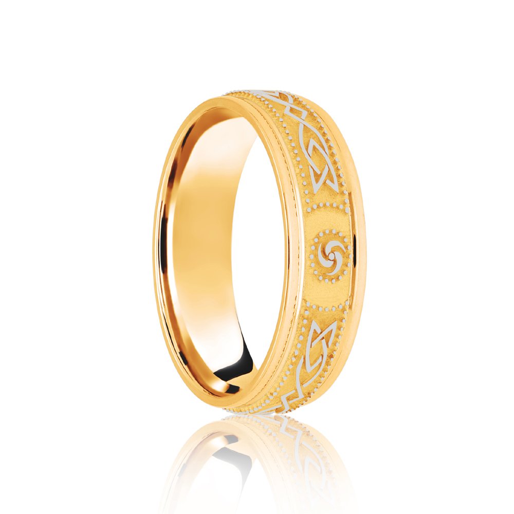 JN Jewellery 18ct Yellow & White Flat Court 6mm Celtic Laser Engraved Wedding Band. Each Bespoke jewellery item is unique and made to order, and therefore will be despatched within 4-6 weeks. Please note that bespoke, personalised and engraved items cannot be returned.