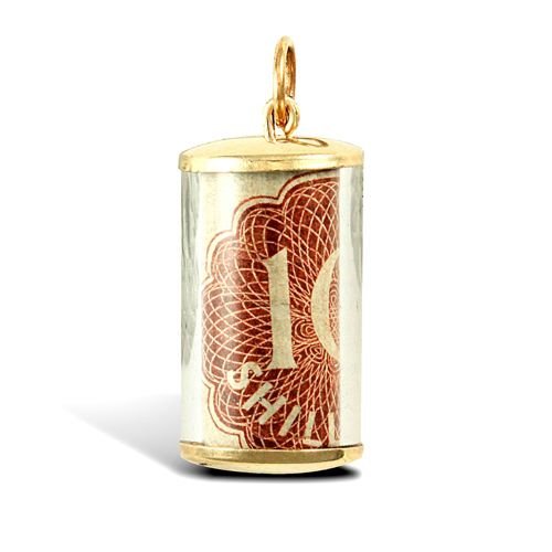 9ct yellow gold ten shilling note pendant with a plastic casing. (Height includes bale/loop)